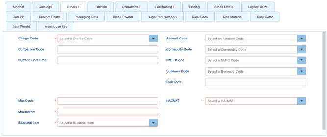 This tab allows you to group and identify items within certain characteristics such as a maximum orderable quantity or affiliating an item with a charge code.