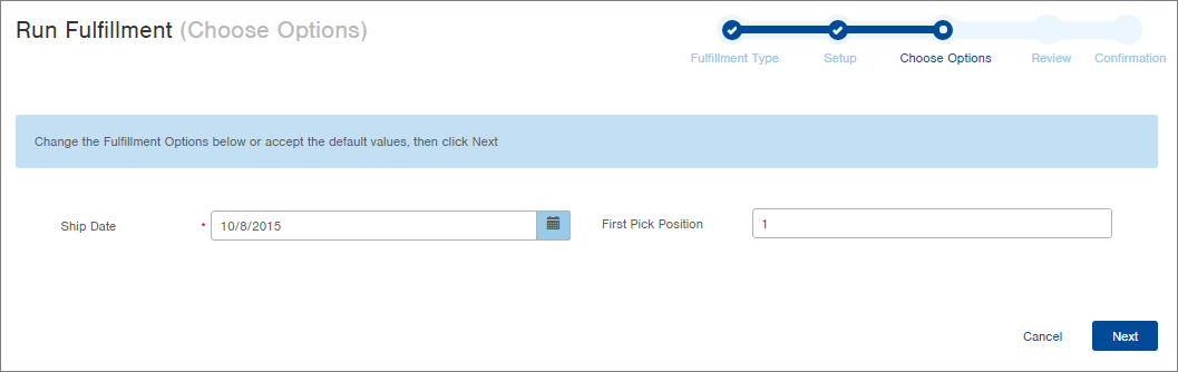 - Which fulfillment selections? You can fulfill based on a Fulfillment Plan (predefined set of fulfillment selections), start with a blank slate, or perform just allocation (bypassing Pick, Pack, Ship processes).