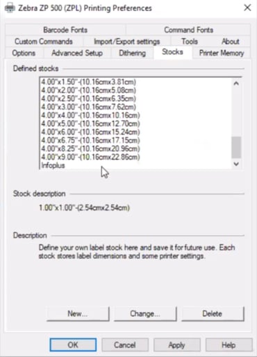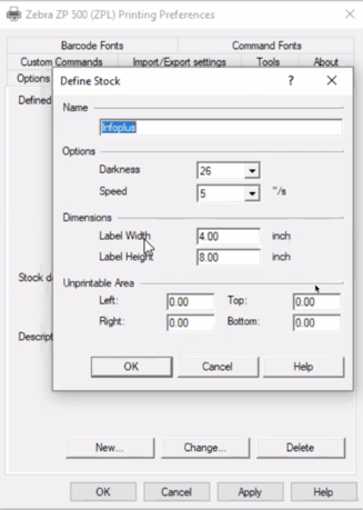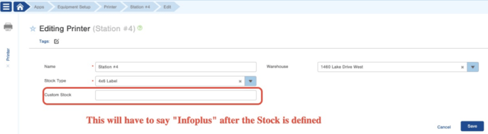 Sometimes users have issues where the labels being printed are too big or too small. There is a field on the printers that are created in Infoplus called "Custom Stock". In there, users can add the custom stock sizes that are added to their Printer in the printer settings.