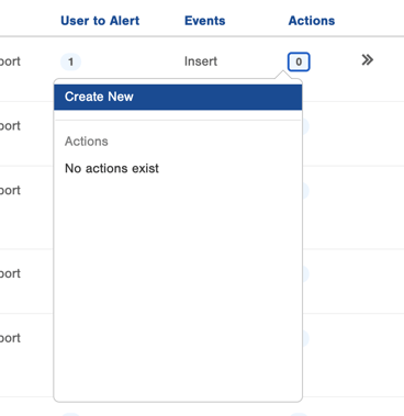 - Find the Trigger you just created on the grid, then navigate to the right to the Actions column and click on the '0'. Then, click 'Create New'