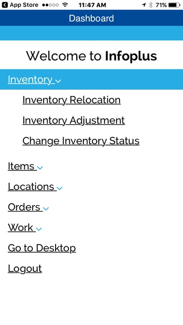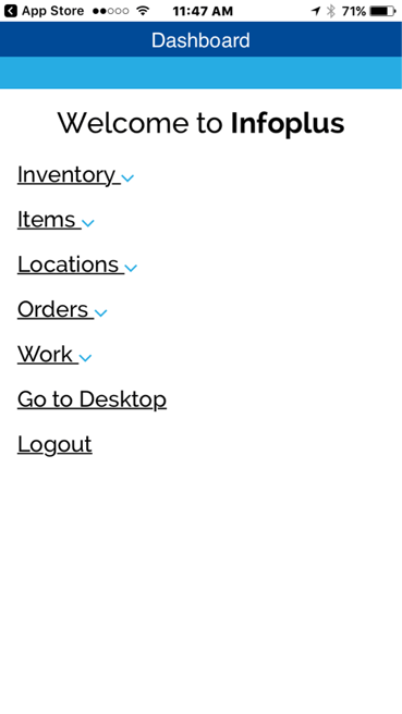 - On a mobile device, log into the Infoplus App. The Infoplus Dashboard appears.
